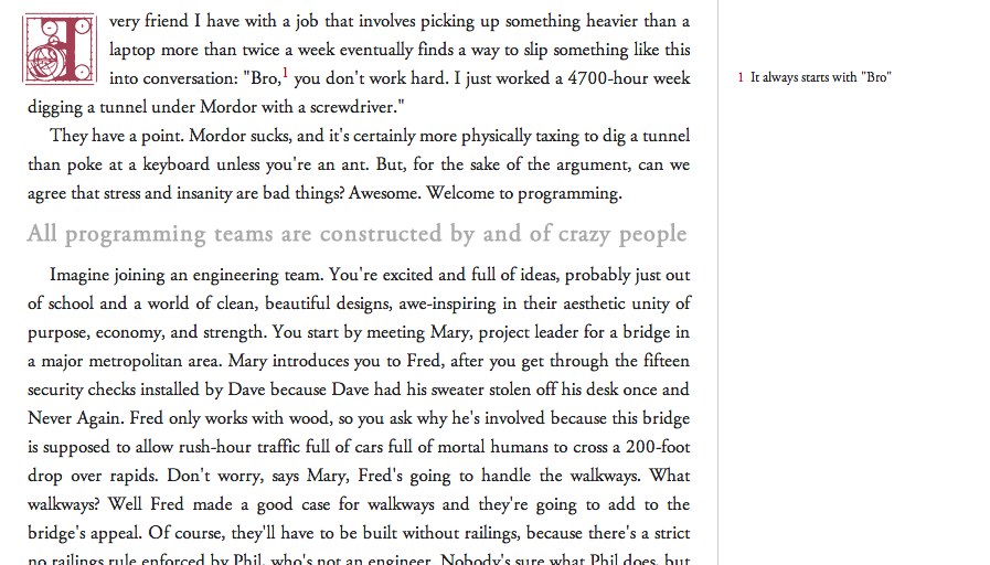 Simple as in straight forward, no bullshit, clean. This was the example I had unknowingly been waiting for. The idea of making a blog modeled after this design started seeping into my thoughts. Before long the oh so familiar madness had taken hold8 and I HAD to code it.